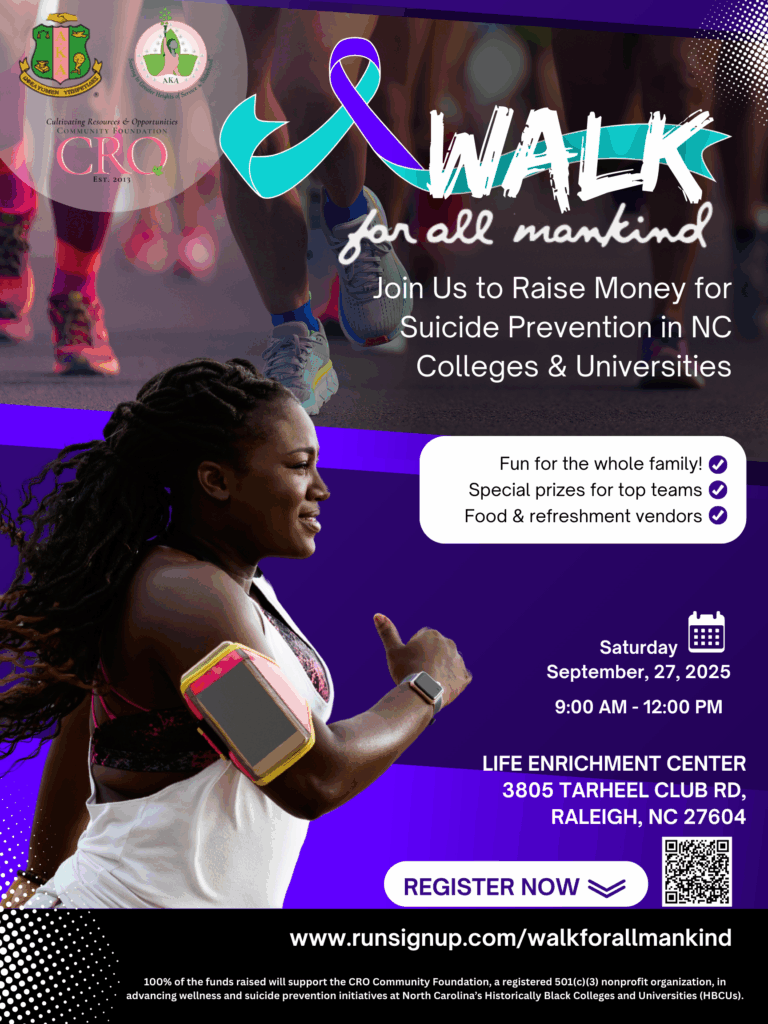 Join us for an inspiring and impactful event as Cultivating Resources & Opportunities Community Foundation and Alpha Kappa Alpha Sorority, Incorporated, Chi Rho Omega Chapter proudly present the Walk for All Mankind Suicide Prevention Fundraiser. This charity walk is dedicated to raising essential funds for student counseling centers at Historically Black Colleges and Universities (HBCUs) in North Carolina, with a focus on suicide prevention and mental health awareness. Let’s come together to support our students and promote a future where every life is valued and protected.